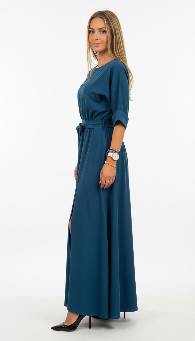 Kleita ar šķēļumu kas izceļ kāju, kleitai ir kabatas
