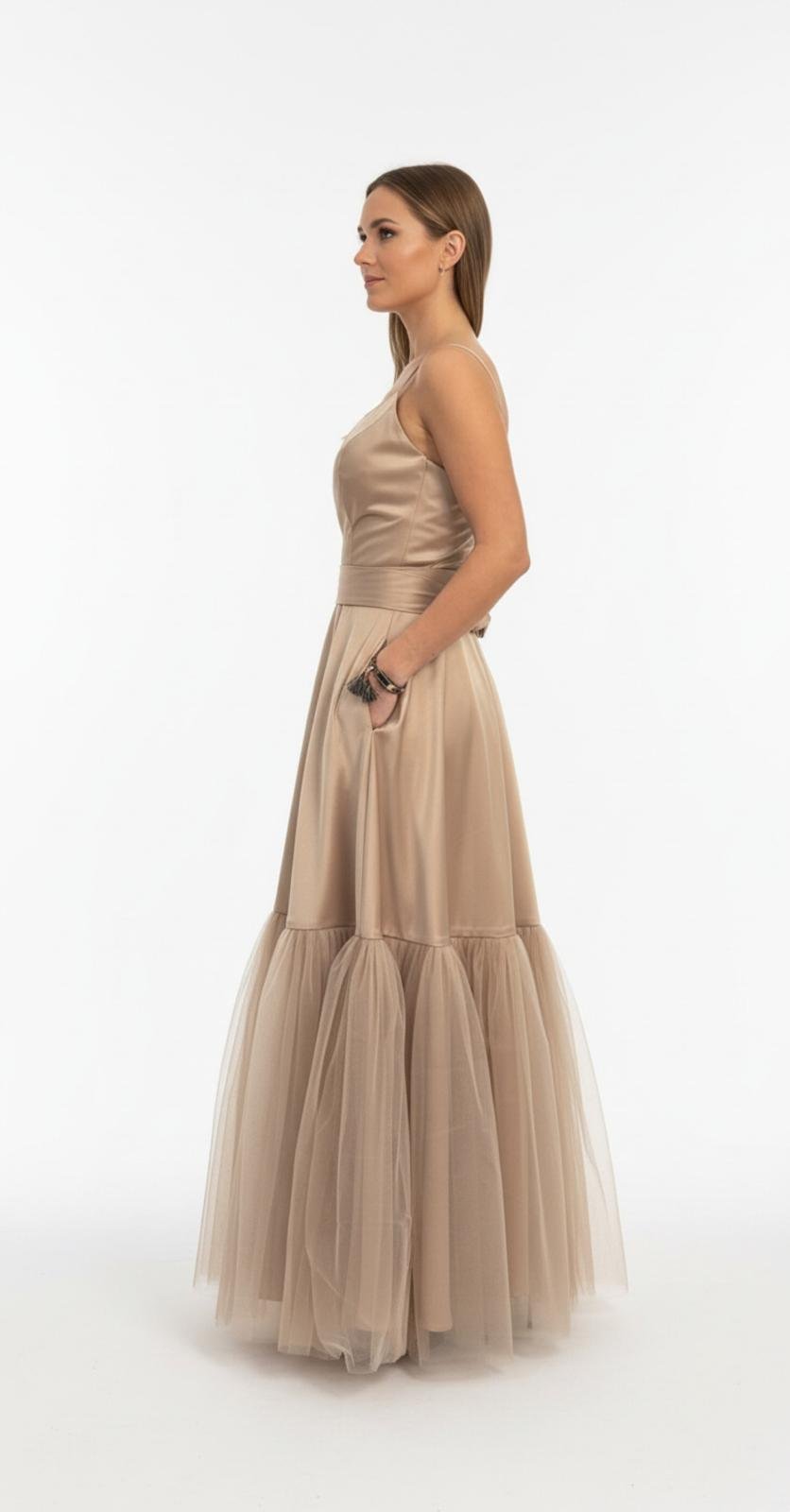 Kleita ar šķēļumu kas izceļ kāju, kleitai ir kabatas